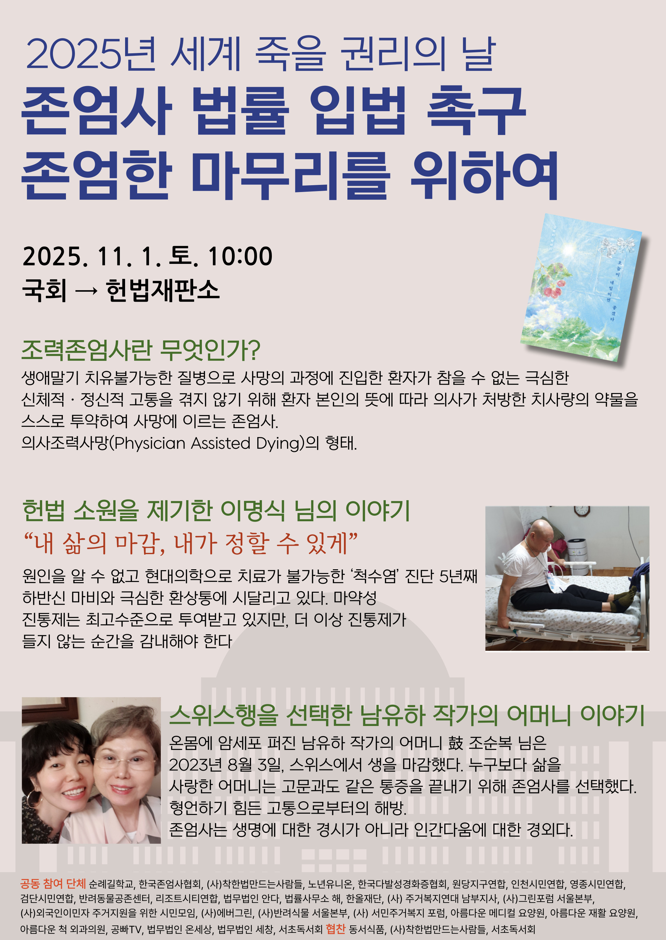 [2025년 11월 1일 행사안내] 세계죽을권리의 날 기념 '존엄사 법률 입법 촉구 걷기대회'